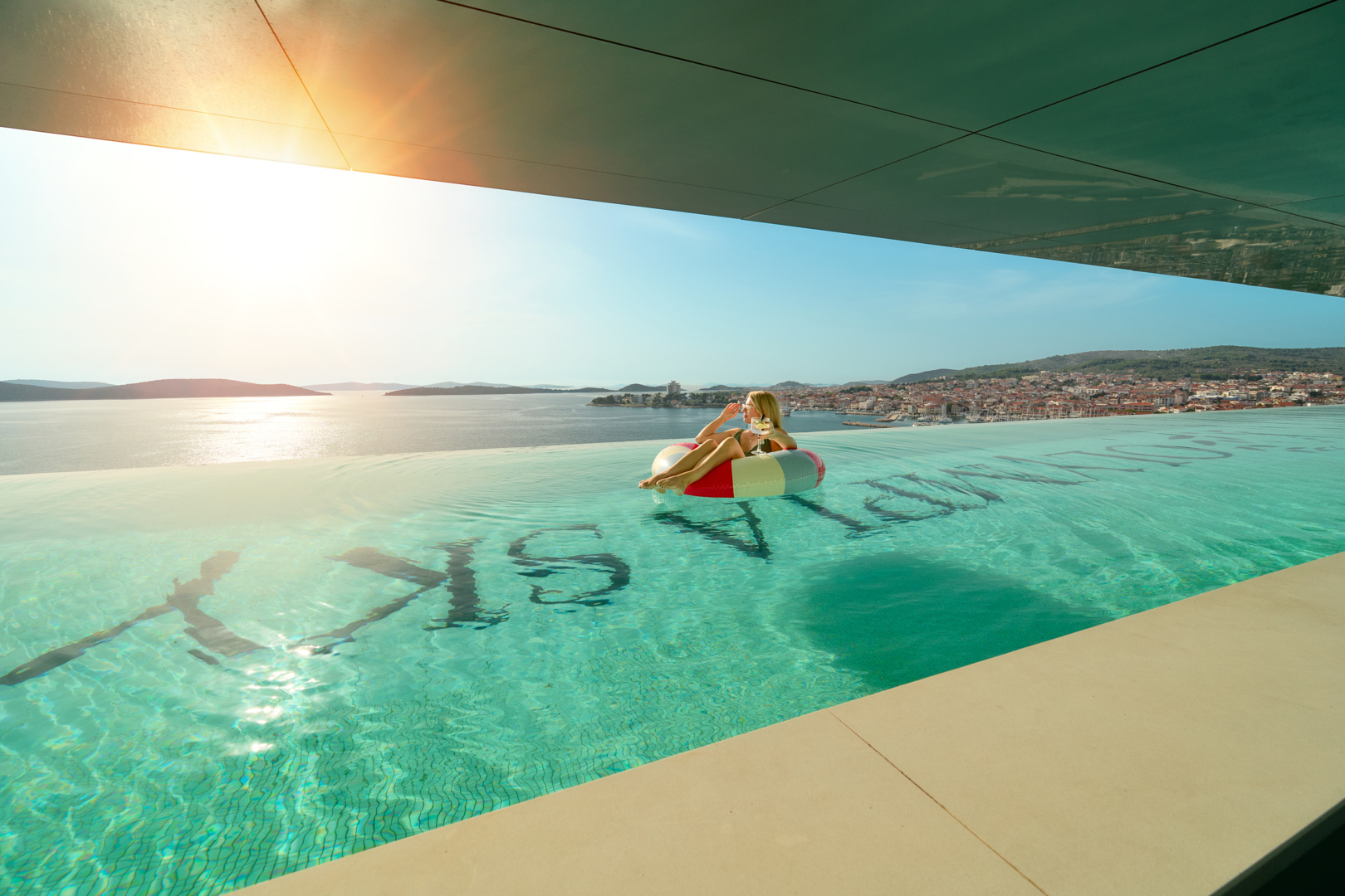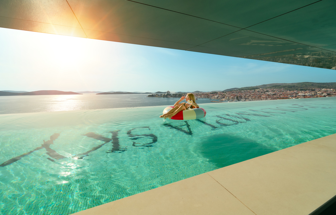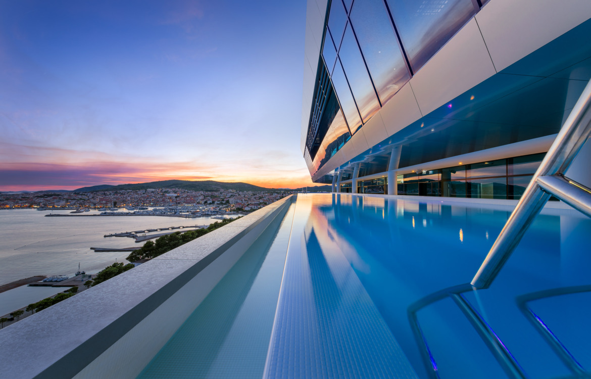 Vom neunten Stock des Hotels Olympia Sky bietet sich ein beeindruckender Panoramablick auf Vodice und die Inselgruppe.