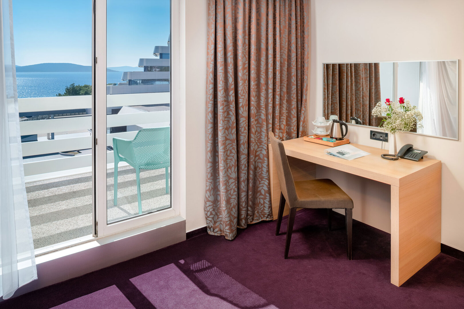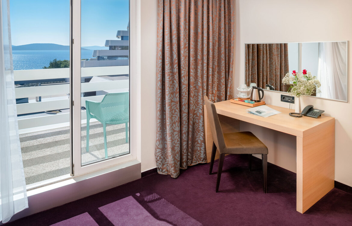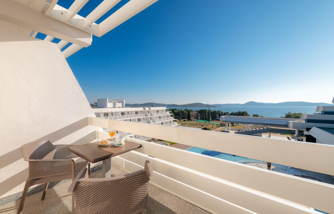 Komfortabel bieten die Superior-Doppelzimmer mit Meerblick ein unvergessliches Urlaubserlebnis mit atemberaubendem Blick auf die Adria und die umliegenden Inseln. Jedes Zimmer verfügt über einen privaten Balkon, ideal zum Entspannen in mediterraner Atmosphäre.