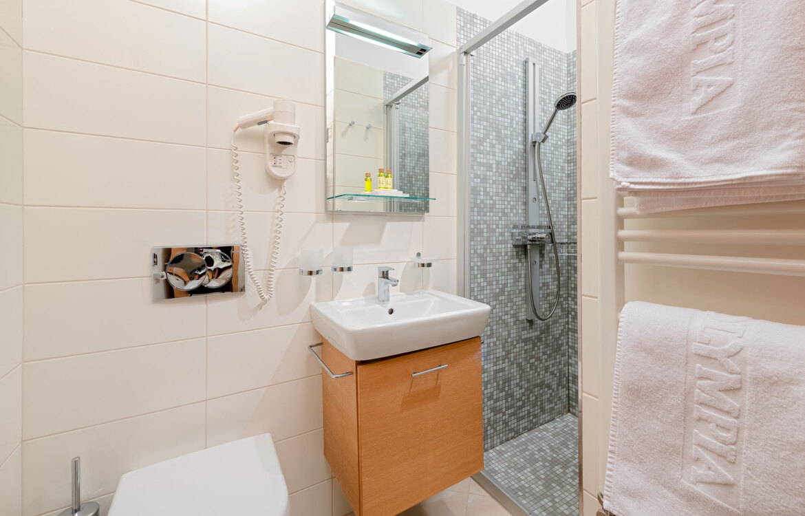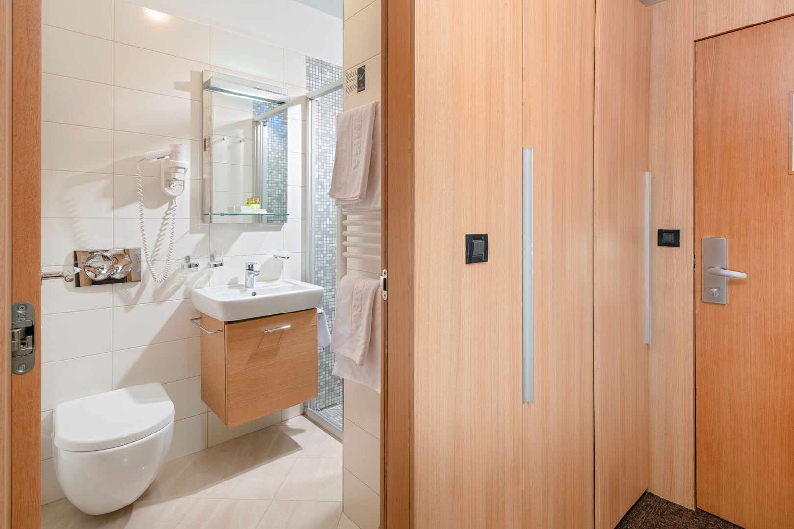 Die Zimmer sind mit einem Doppelbett oder zwei Einzelbetten ausgestattet, mit der Möglichkeit, ein drittes Bett hinzuzufügen, und können auch als Einzelzimmer genutzt werden. Elegant eingerichtet, bieten sie einen Schreibtisch sowie ein modernes Badezimmer mit Dusche – für ein angenehmes und funktionales Wohnerlebnis.