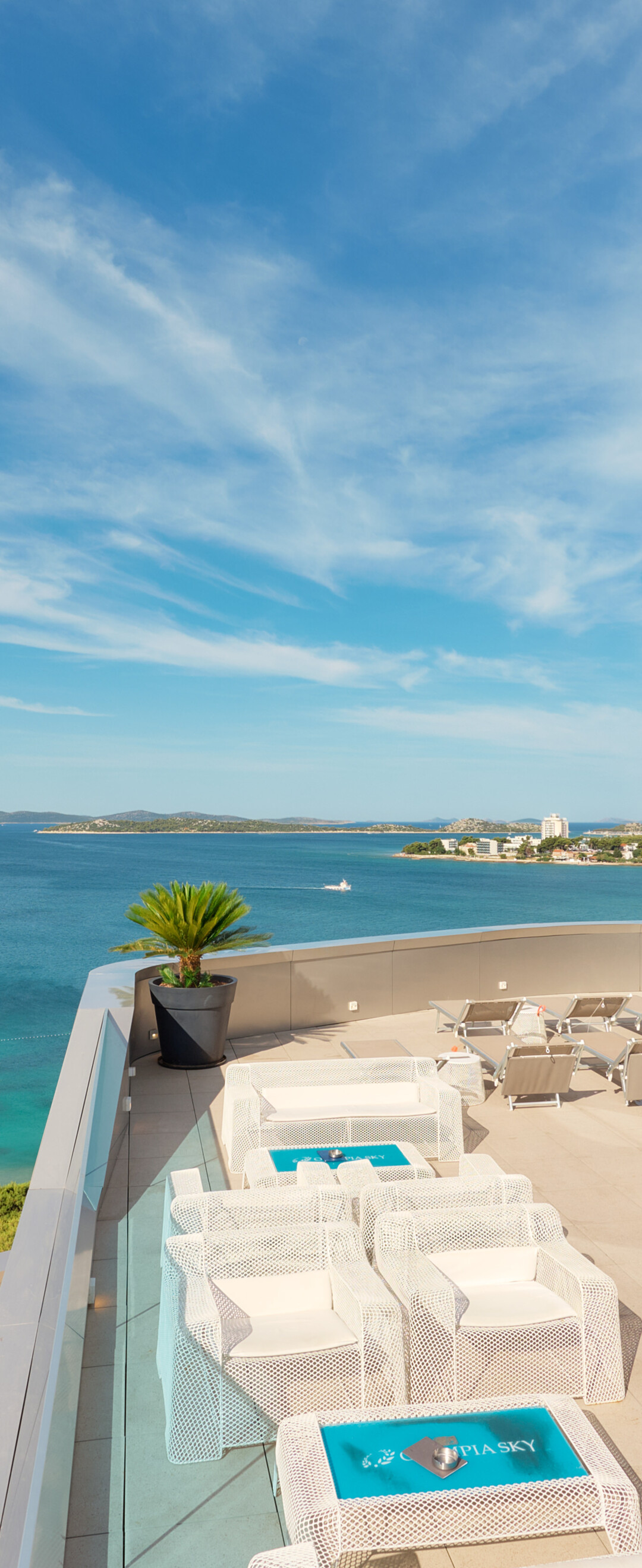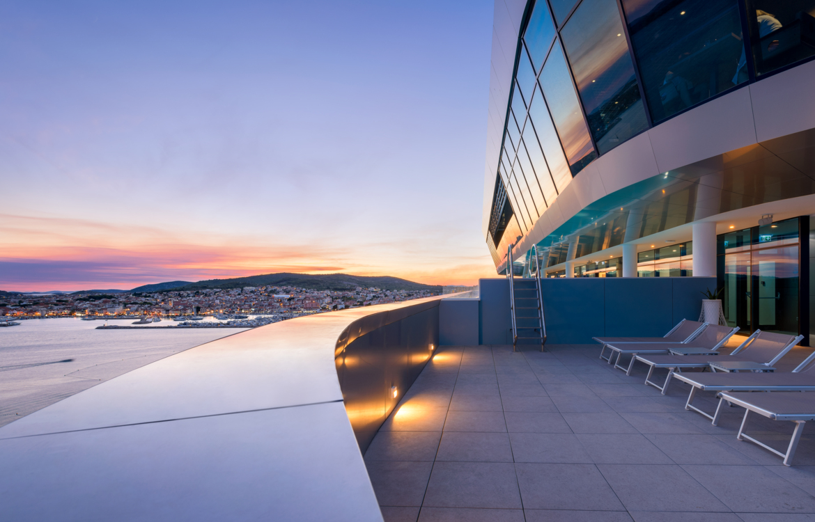 From the ninth floor of Hotel Olympia Sky, the horizon opens endlessly over Vodice and the nearby islands. The sea stretches out before you, and every glance feels like a postcard. - Relaxed yet refined