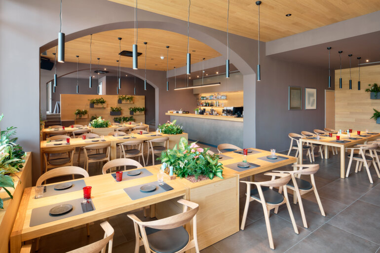 Prostran i svijetao restoran koji zimi odiše toplinom i blagdanskim ugođajem.